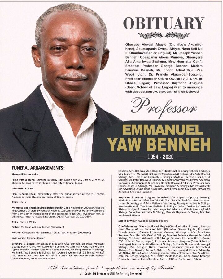 The murdered University of Ghana law lecturer, Prof Emmanuel Yaw Benneh, will be laid to rest on Saturday, November 21, 2020.