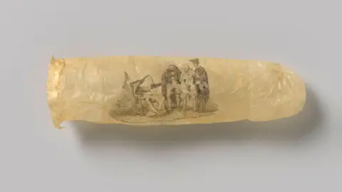 It is thought to be made of a sheep’s appendix and features an explicit print representing a nun and three clergymen.