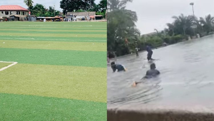 In a video that has since gone viral, residents, mostly children and teenagers, were seen swimming in the pitch-turned-pool while others played football in the facility.