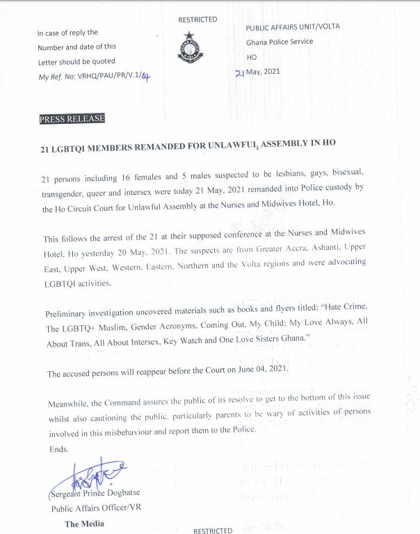 The accused persons, 16 females and five males, suspected to be lesbians, gays, bisexual, transgender, queer and intersex, are believed to be from the Greater Accra, Ashanti, Upper East, Upper West, Western, Eastern, Northern and Volta regions.