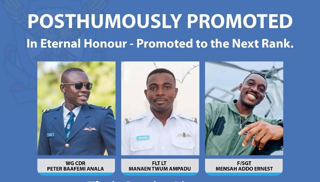 “Accordingly, I have approved the following promotions: Squadron Leader Peter Baafemi Anala is posthumously promoted to Wing Commander. Flying Officer Manaen Twum Ampadu is promoted to Flight Lieutenant. Sergeant Ernest Mensah Addo is promoted to Flight Sergeant.
