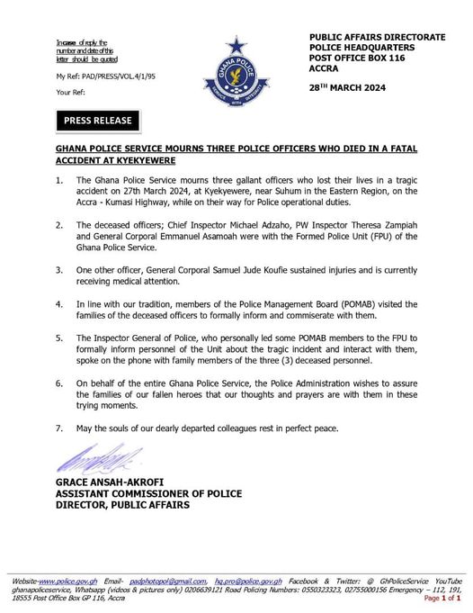 Immediately after the accident, the other police officers in the convoy rushed to assist the officers in the accident vehicle and rushed them to the Suhum Government Hospital, where the three officers were confirmed dead.