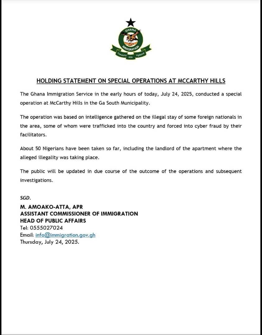 The Ghana Immigration Service (GIS) has arrested 50 Nigerian nationals, including a landlord, during a dawn operation at McCarthy Hills in the Ga South Municipality.