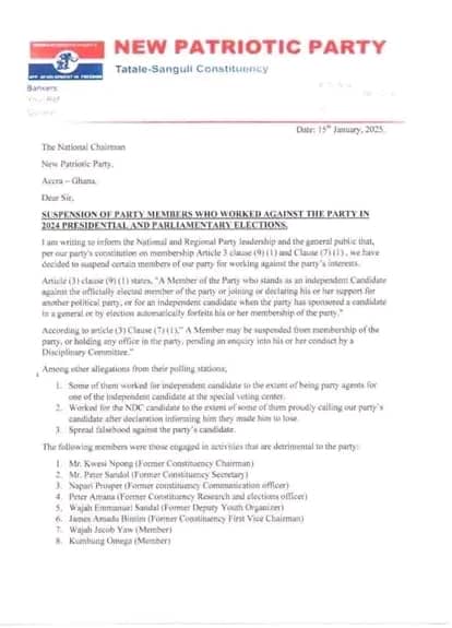 In a letter signed by the constituency chairman and addressed to the party’s national and regional executives, it was alleged that the suspended members worked against the NPP candidate, an act deemed a violation of the party’s constitution.