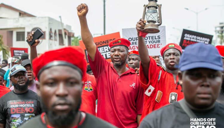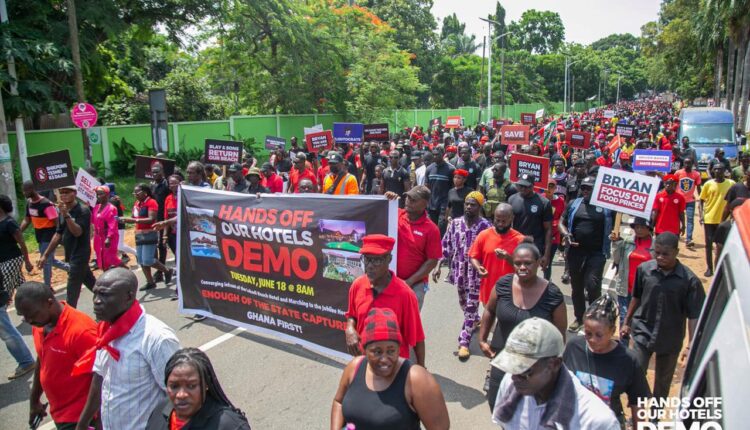 The initial protest was held to demand that the government halt the sale of a 60 per cent stake in four hotels owned by the Social Security and National Insurance Trust (SSNIT) to Rock City Hotel, a company owned by the Minister of Food and Agriculture, Bryan Acheampong.