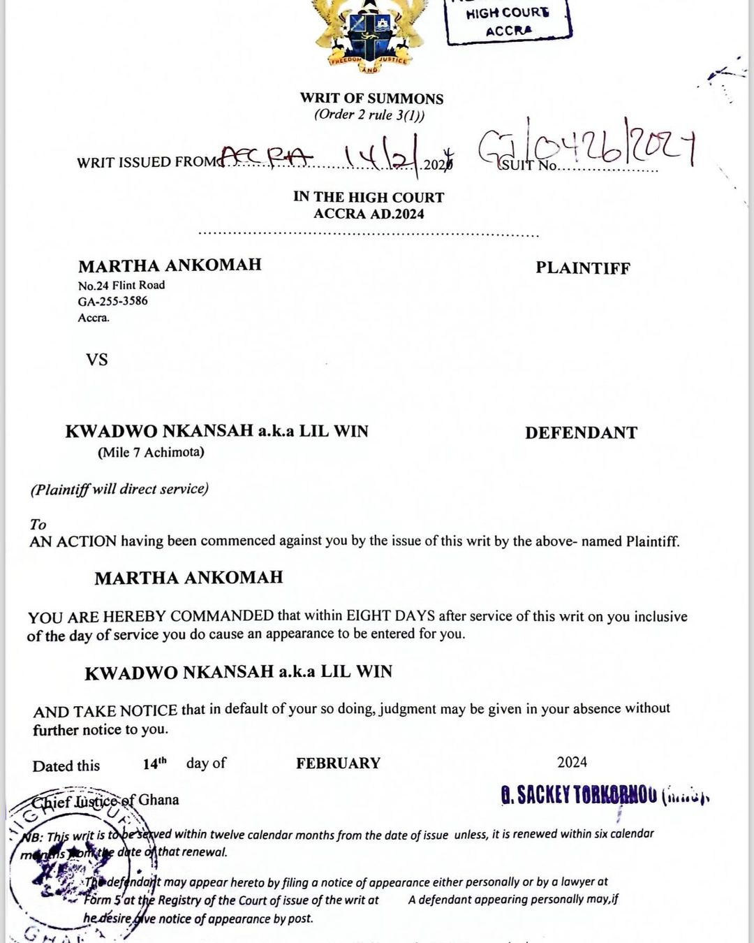 In response to LilWin’s criticisms, Martha Ankomah has taken legal action, filing a defamation lawsuit against the actor. The lawsuit, issued on February 14, 2024, summons LilWin to court to explain his defamatory comments as perceived by the actress.