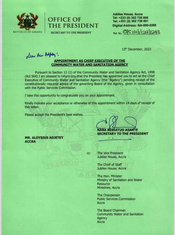 President Nana Addo Dankwa Akufo-Addo has appointed Aloysius Adjetey as the Chief Executive Officer of the Community Water and Sanitation Agency of the Republic of Ghana.