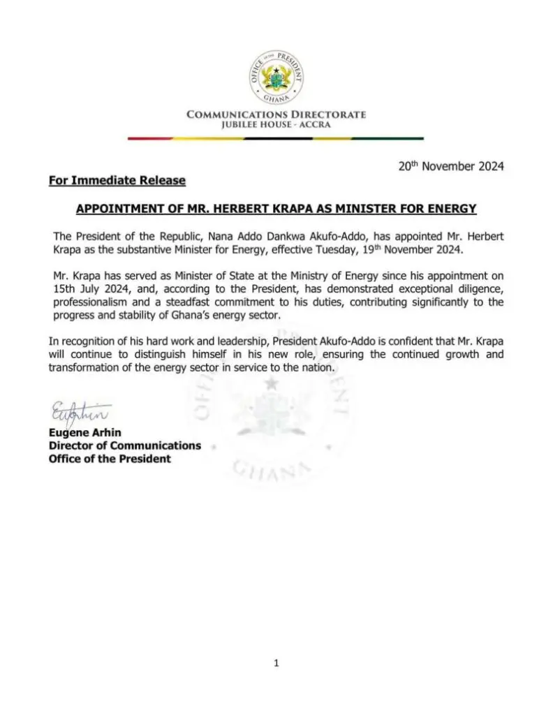 In a statement issued on November 20, 2024, the Director of Communications at the Office of the President, Eugene Arhin, said according to the president, Mr Krapa demonstrated exceptional diligence, professionalism, and a steadfast commitment to his responsibilities as Minister of State.