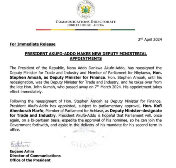 Following the reassignment, the President has appointed Kofi Ahenkorah Marfo, the MP for Achiase, as Deputy Minister for Trade and Industry.
