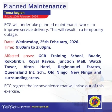 Finally, on Thursday, February 26, a maintenance exercise from 9:00am to 5:00pm will impact “Lakeside Estate Com. 6 & 8, New Legon, Block factory (East Legon), Sasaabi Township, Mensah Bar, and surrounding areas.”