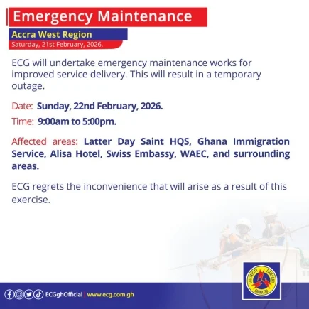 In the Accra West Region, an emergency maintenance operation is planned for Sunday, February 22, from 9:00am to 5:00pm, which will affect “Latter Day Saint HQS, Ghana Immigration Service, Alisa Hotel, Swiss Embassy, WAEC, and surrounding areas”.