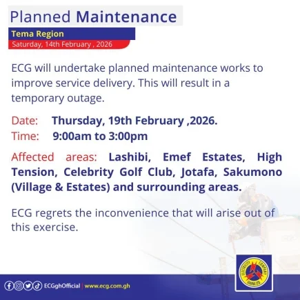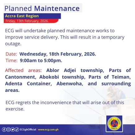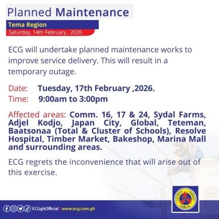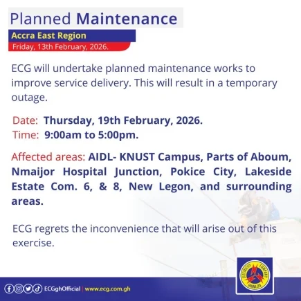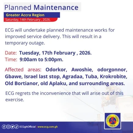 The Electricity Company of Ghana (ECG) has announced a series of scheduled maintenance activities across various regions, commencing on Monday, February 16, 2026.