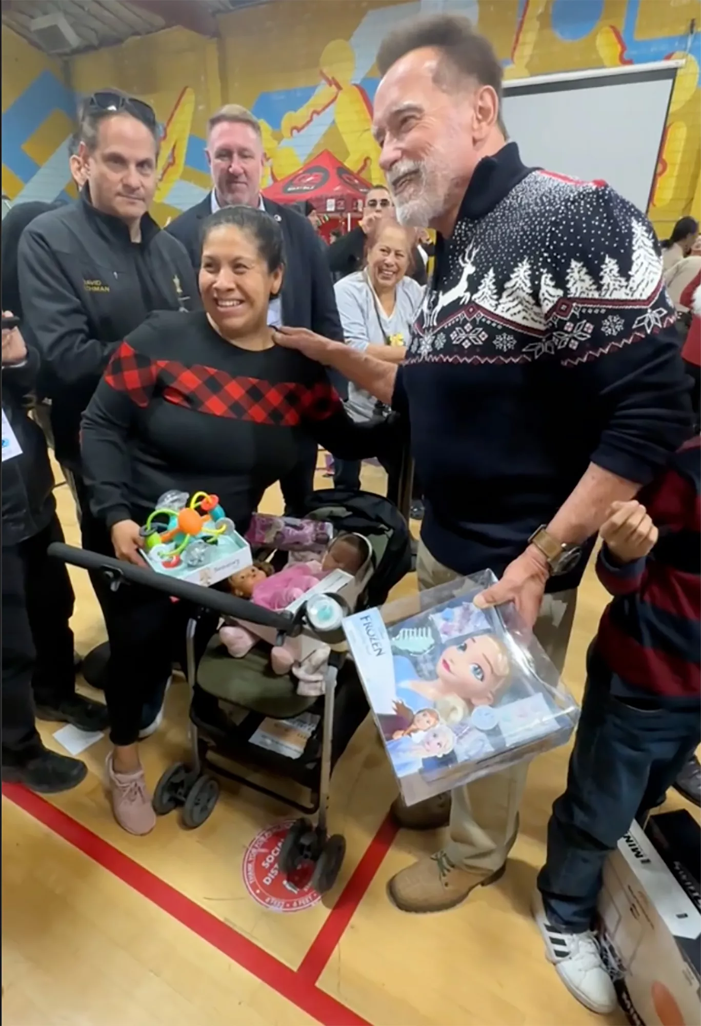 Elsewhere in the video, Schwarzenegger gave out Christmas gifts to local visitors, which included groups of families and children. He also chatted with them and posed for photos at the center.