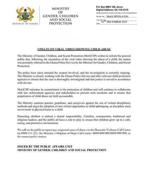 The Ministry of Gender, Children and Social Protection (MoGCSP) confirmed the arrest in a statement issued on Tuesday, December 16, 2025, indicating that the case was swiftly referred to the police by the Minister after the video began circulating.