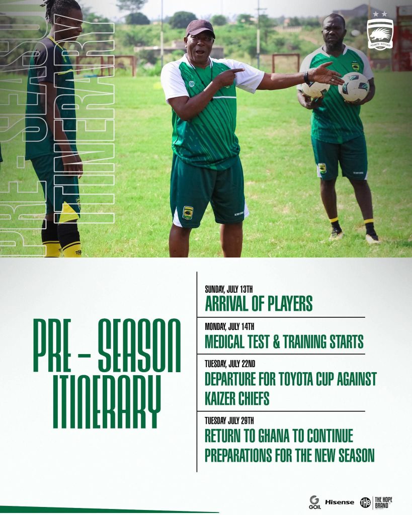 Asante Kotoko have officially released their pre-season itinerary ahead of the 2025/26 football season, which includes a highly anticipated trip to South Africa for the prestigious Toyota Cup against Kaizer Chiefs.