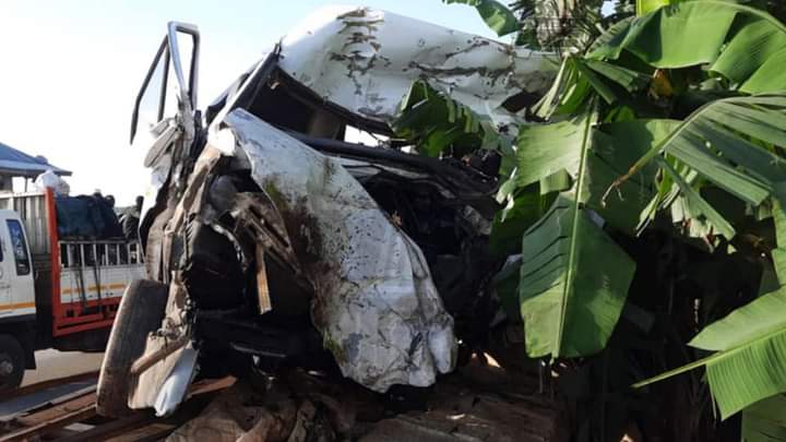 A Toyota minibus with registration number AS 2872-20 veered off its lane and collided head-on with a DAF tipper truck with registration number NR 578 loaded with sand.