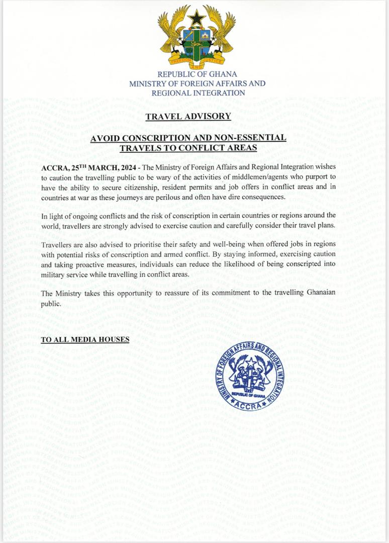 The Ministry of Foreign Affairs and Regional Integration has cautioned Ghanaians against embarking on non-essential travels to conflict-prone countries.