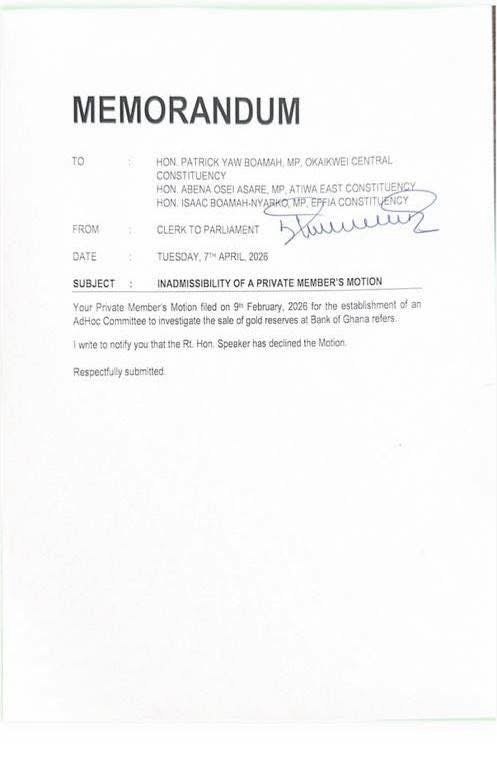 The Speaker of Parliament, Alban Bagbin, dismissed a motion filed by the Minority Caucus seeking to establish a committee to probe the alleged sale of gold from the central bank’s reserves.