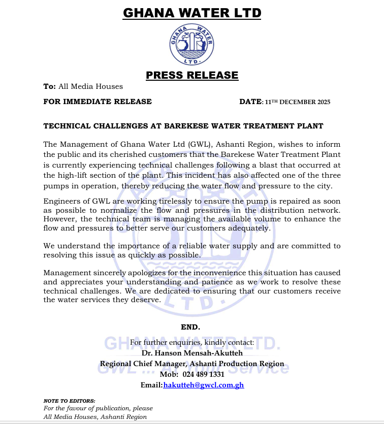 The Ghana Water Limited (GWL) in the Ashanti Region has reported significant technical issues at the Barekese Water Treatment Plant following a blast at its high-lift section.