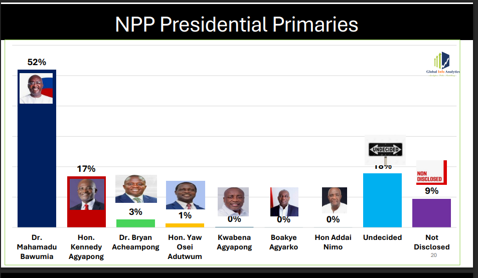 Former Vice President Dr. Mahamudu Bawumia is the leading candidate to steer the New Patriotic Party (NPP) into the 2028 general elections, as indicated by a recent poll from Global Info Analytics, dated August 21, 2025.