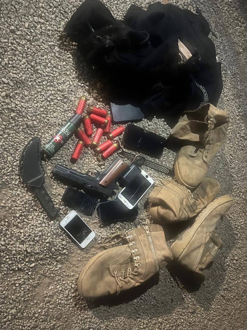 Items retrieved from the suspects include a pistol with two rounds of 32 ammunition, eleven BB cartridges, pepper spray, desert boots, multiple mobile phones, and a black pullover believed to have been used during the attacks.