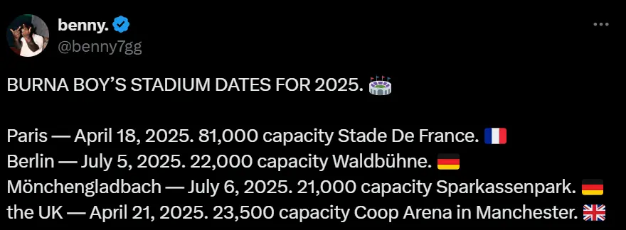 Nigerian international superstar Burna Boy has shared the dates for his major concerts in the United Kingdom, France, and Germany.