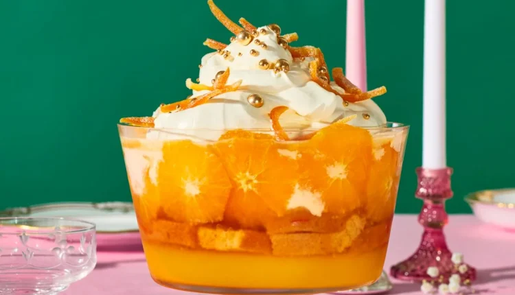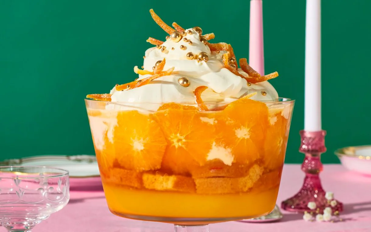 Dollop the cream on top of the trifle to form luxurious waves, then decorate with the candied orange peel, and with edible gold balls if you fancy.