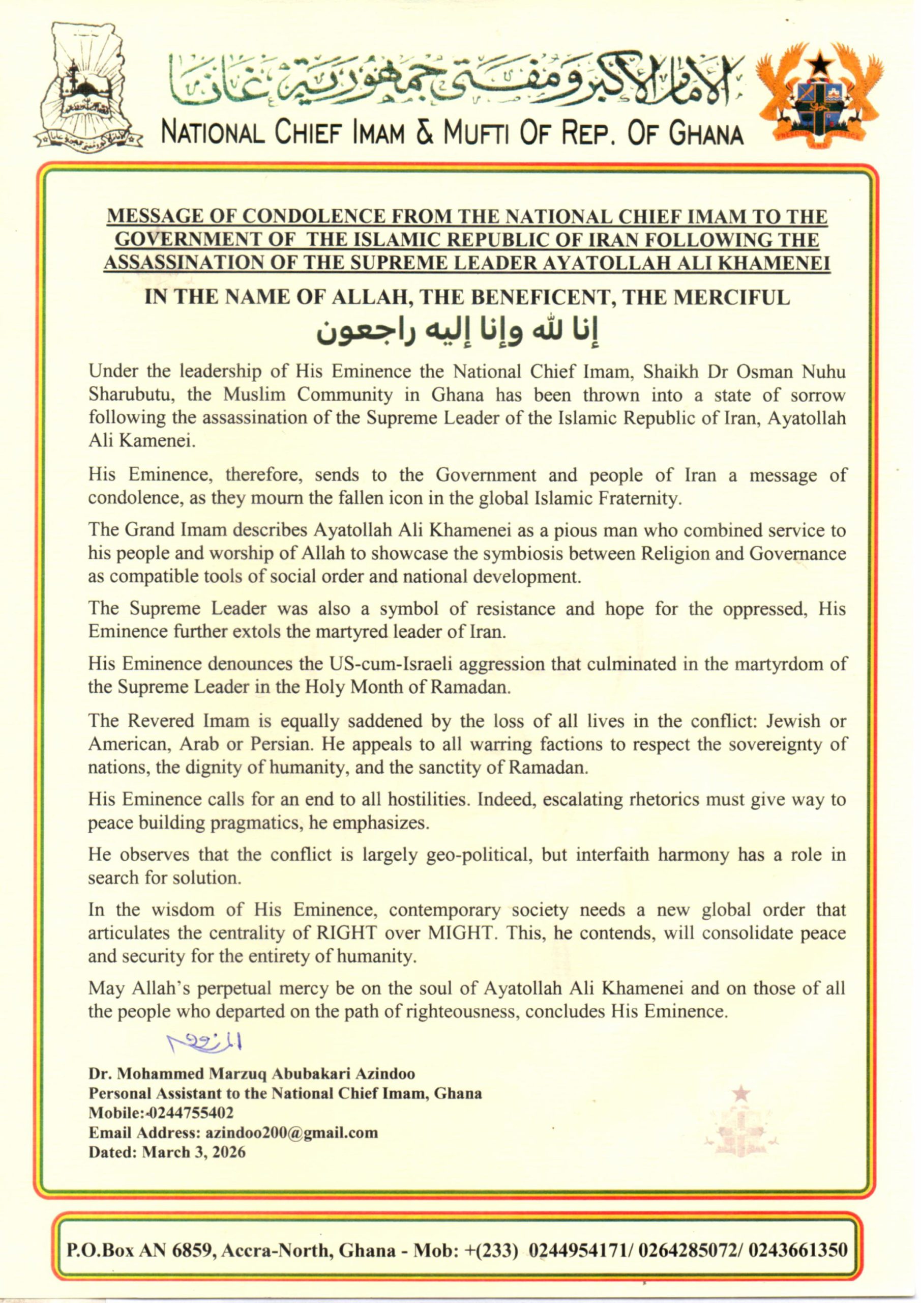 In a statement issued on Tuesday, 3 March, the Muslim community in Ghana described the incident as a moment of profound grief for the global Islamic family.