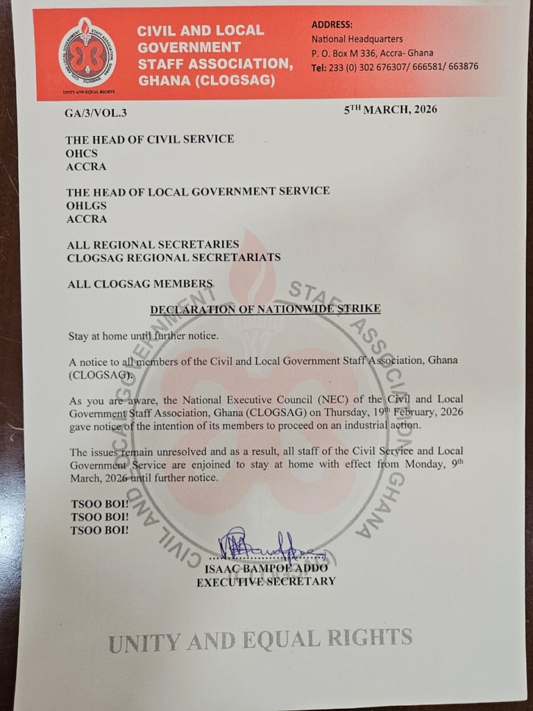 The Civil and Local Government Staff Association of Ghana (CLOGSAG) has announced a nationwide strike effective Monday, March 9, 2026.