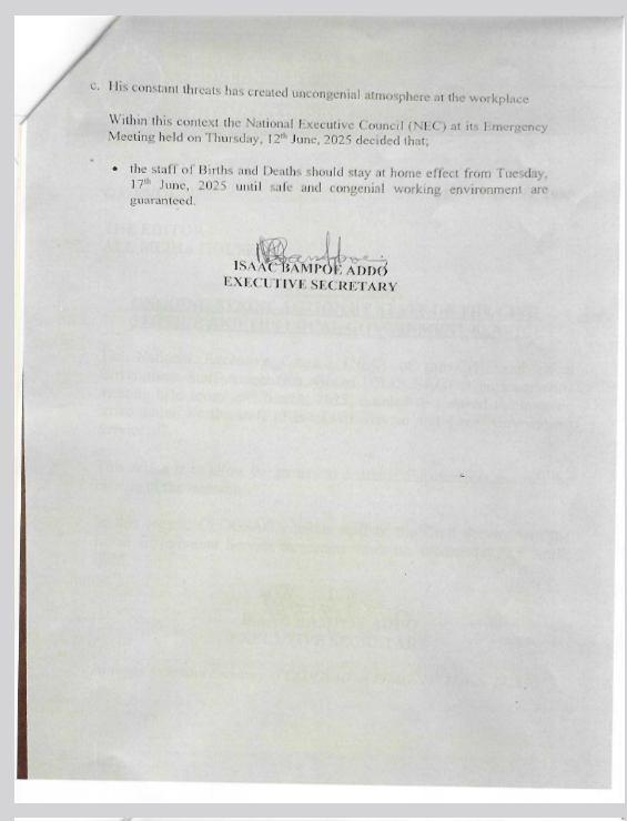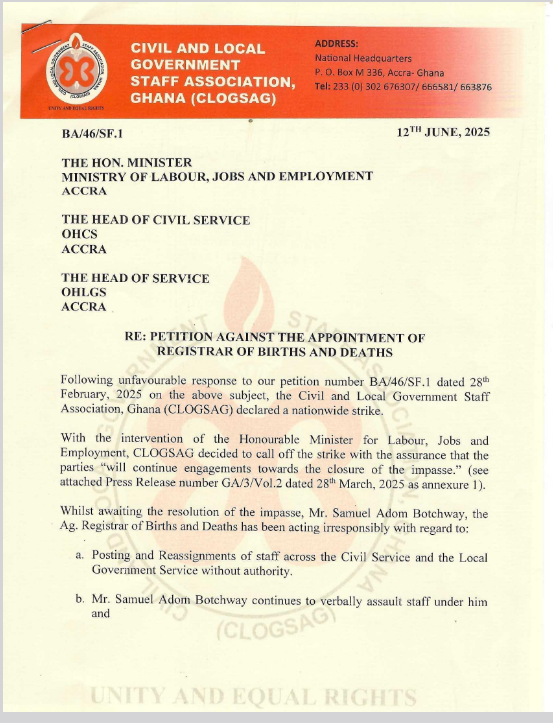 The Civil and Local Government Staff Association, Ghana (CLOGSAG), has ordered all staff of the Births and Deaths Registry nationwide to strike, beginning Tuesday, June 17, 2025, due to the unfavourable actions of the Acting Registrar, Mr. Samuel Adom Botchway.