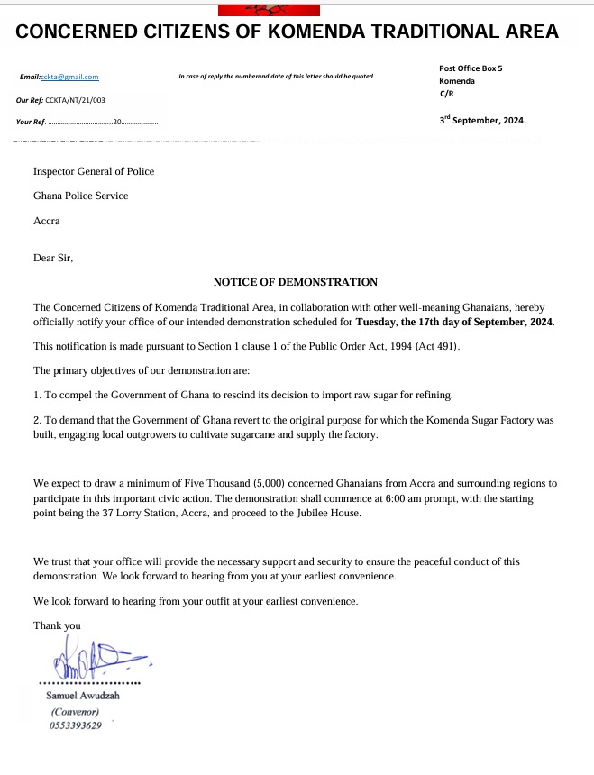 In a statement issued on September 3, 2024, the group formally notified the Ghana Police Service of their plans, per the Public Order Act, 1994 (Act 491).