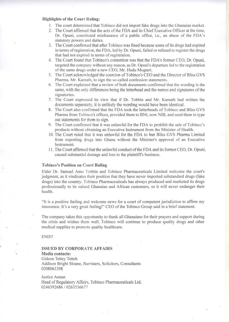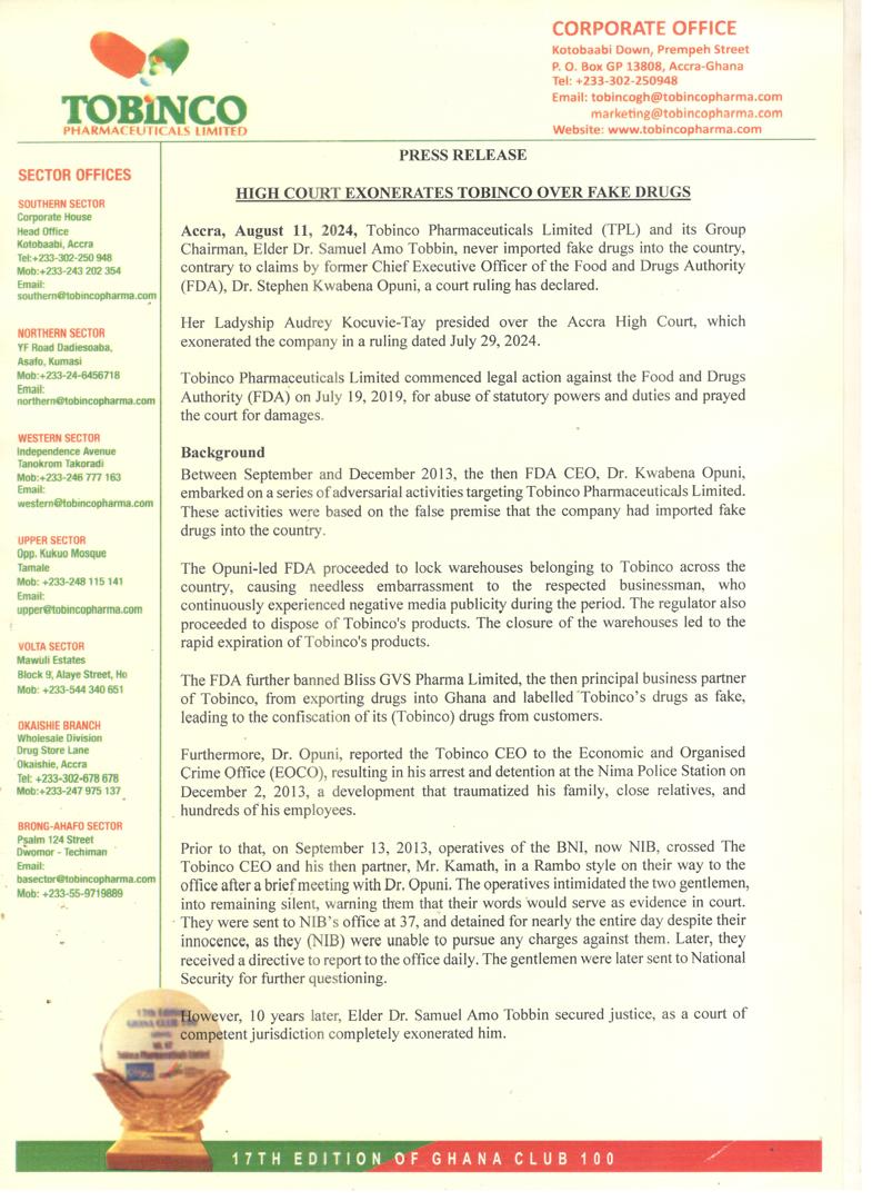The Accra High Court has cleared Tobinco Pharmaceuticals Limited (TPL) and its Group Chairman, Elder Dr Samuel Amo Tobbin, of allegations of importing fake drugs into Ghana.