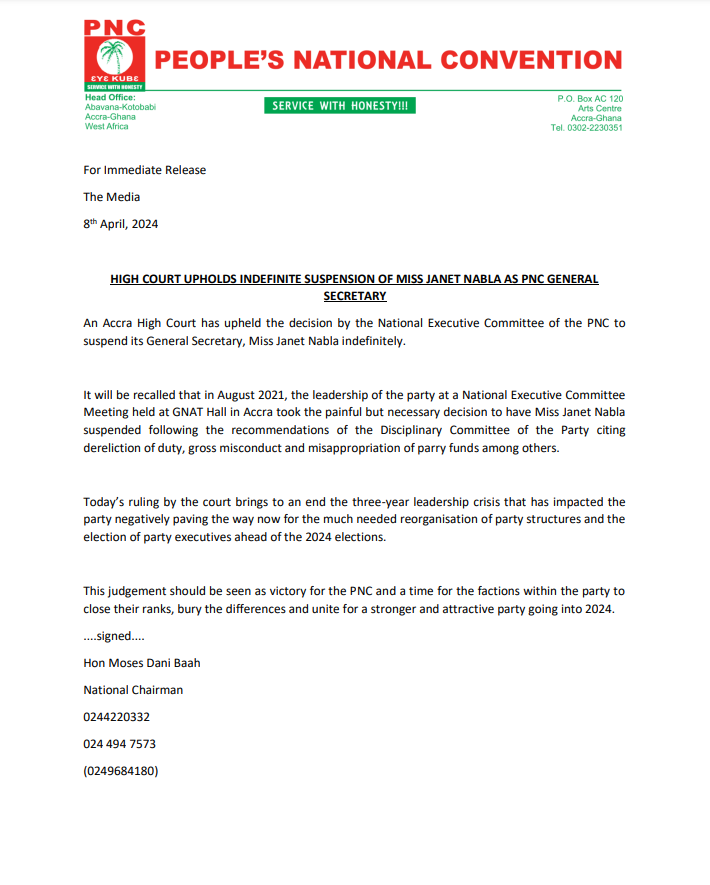 An Accra High Court has upheld the National Executive Committee (NEC) decision of the People’s National Convention (PNC) to suspend its General Secretary, Janet Nabla, indefinitely.