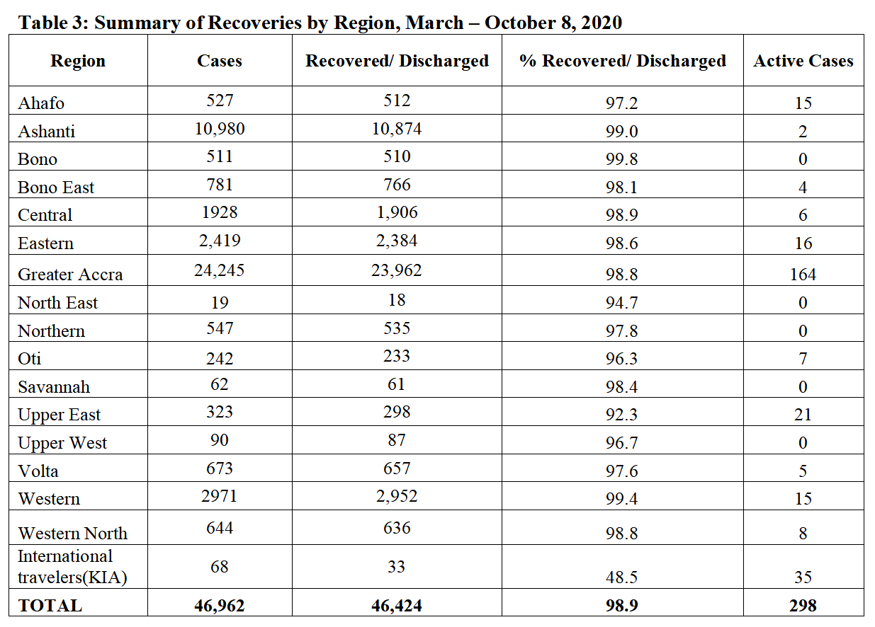Five regions – Bono, North East, Northern, Savannah, Upper West – had no cases in October.