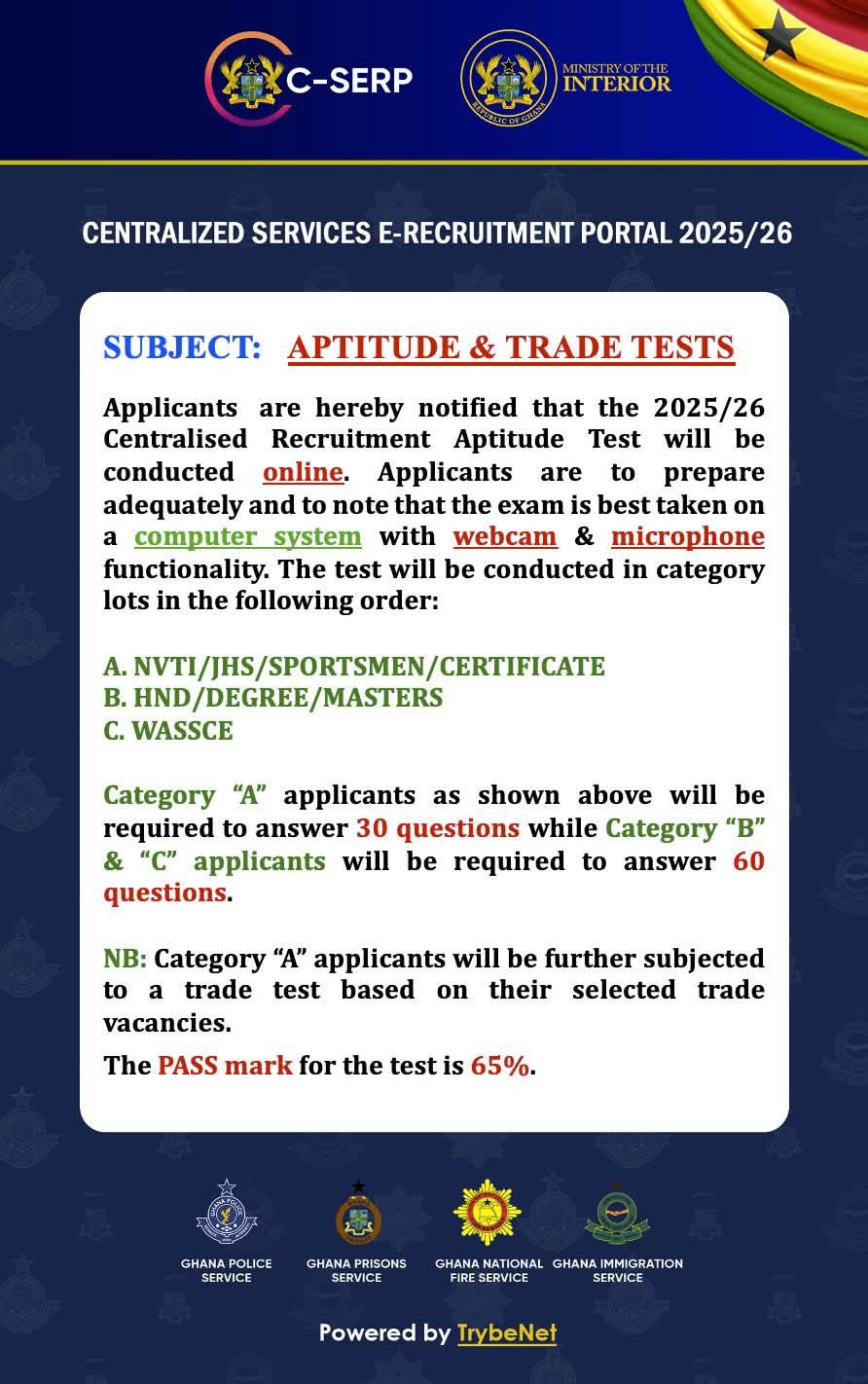 Category C applicants, consisting of WASSCE holders, will have their test from Wednesday, February 18, to Sunday, February 22, 2026, and will also be required to answer 60 questions.