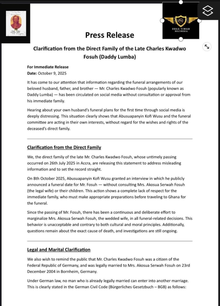 They reminded the public that the late musician was legally married to Mrs. Akosua Serwah Fosuh on 23rd December 2004 in Bornheim, Germany, and that under German law, bigamy is strictly prohibited. Citing Section 1306 of the German Civil Code (Bürgerliches Gesetzbuch), the family said: “A marriage may not be entered into if one of the persons is already married,” stressing that any second marriage under such circumstances is “legally void.”