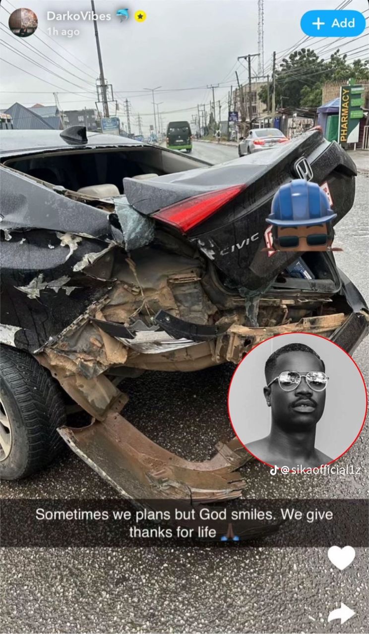 The artiste, known for his unique style and as a former member of the La Meme Gang, revealed details of the incident on Snapchat, where he posted a photo showing a black Honda Civic that appeared badly wrecked from the crash.