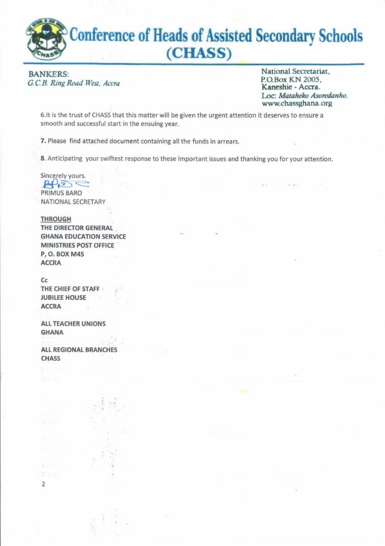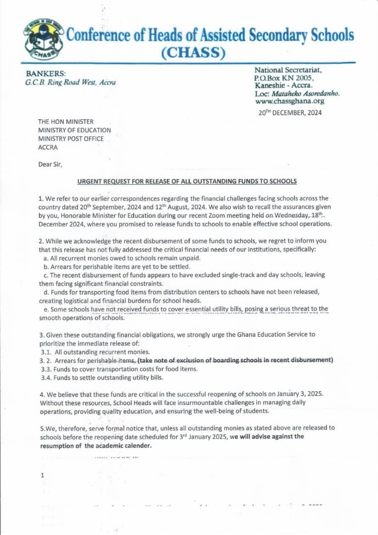 The Conference of Heads of Assisted Secondary Schools (CHASS) is demanding the payment of outstanding funds to Senior High Schools across the country.