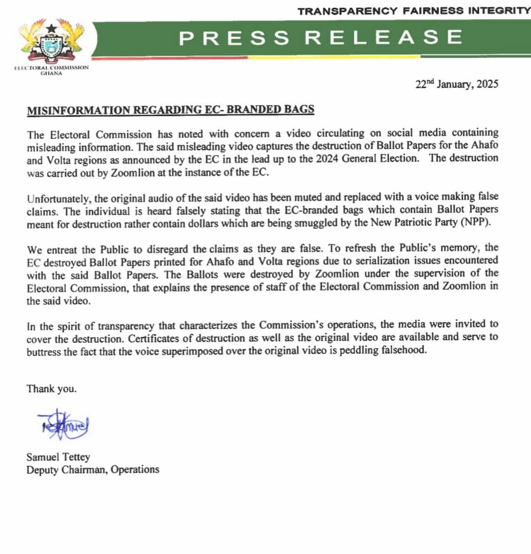 In a statement dated January 22, 2025, and signed by the Deputy Chairman in charge of Operations, Samuel Tettey, the election management body said the bags contained ballot papers and not dollar notes as alleged in the video.