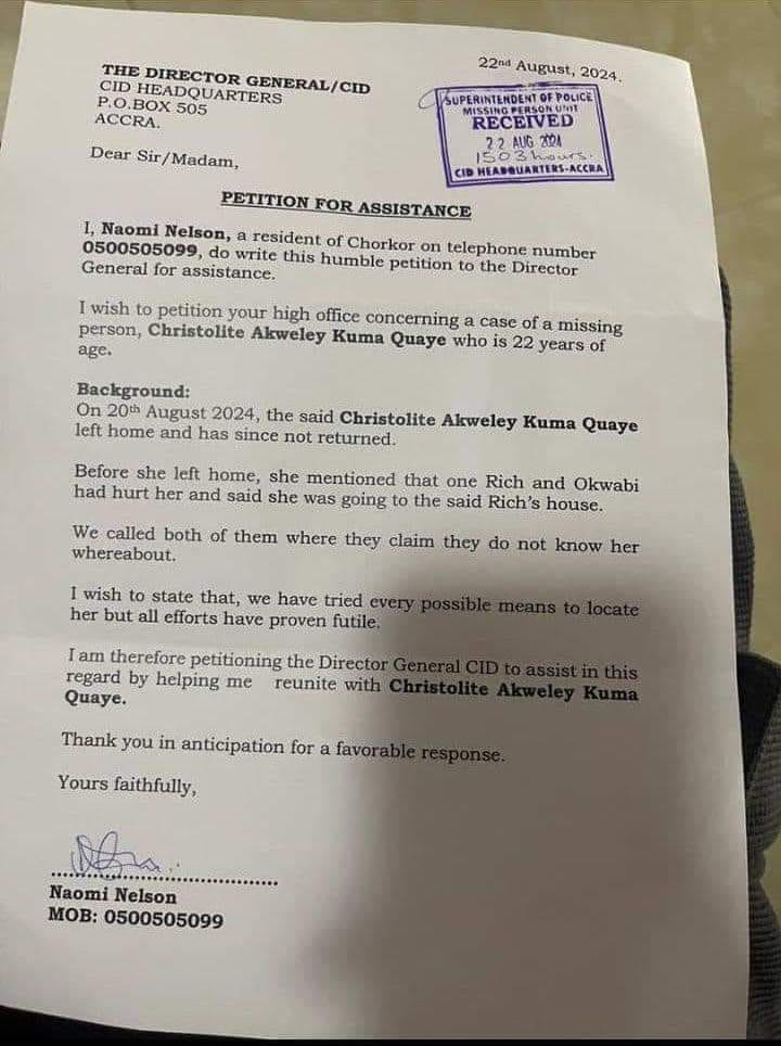 The family of 22-year-old Christolite Akweley Kuma Quaye has petitioned the Criminal Investigations Department (CID) of the Ghana Police Service to aid in the search for her, following her disappearance on August 20, 2024.