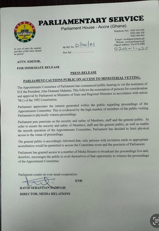 This caution follows the vetting of Kwame Governs Agbodza, Minister-designate for Roads and Highways; Haruna Iddrisu, Minister-designate for Education; and others from Tuesday, January 21, 2025, to date, where numerous witnesses assembled in the vetting room without an invite.