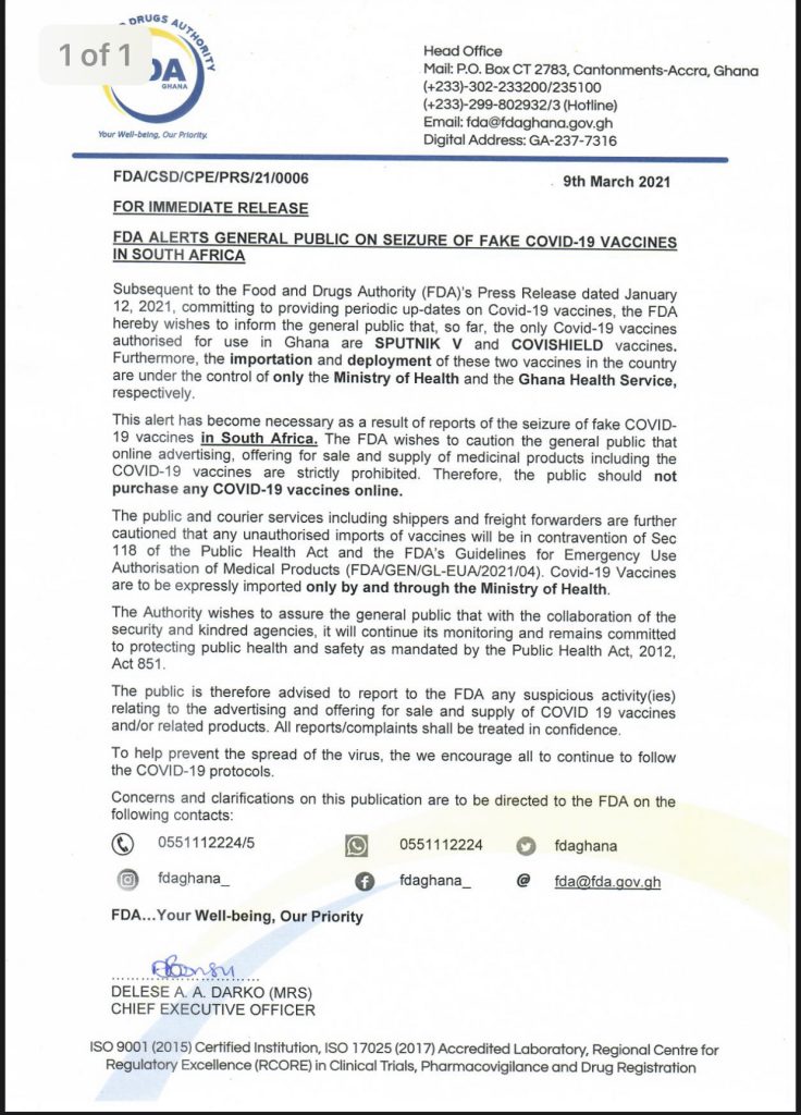 For the avoidance of doubt, the FDA in the statement stated that “so far, the only COVID-19 vaccine authorised for use in Ghana are SPUTNIK V and COVISHIELD vaccines.”