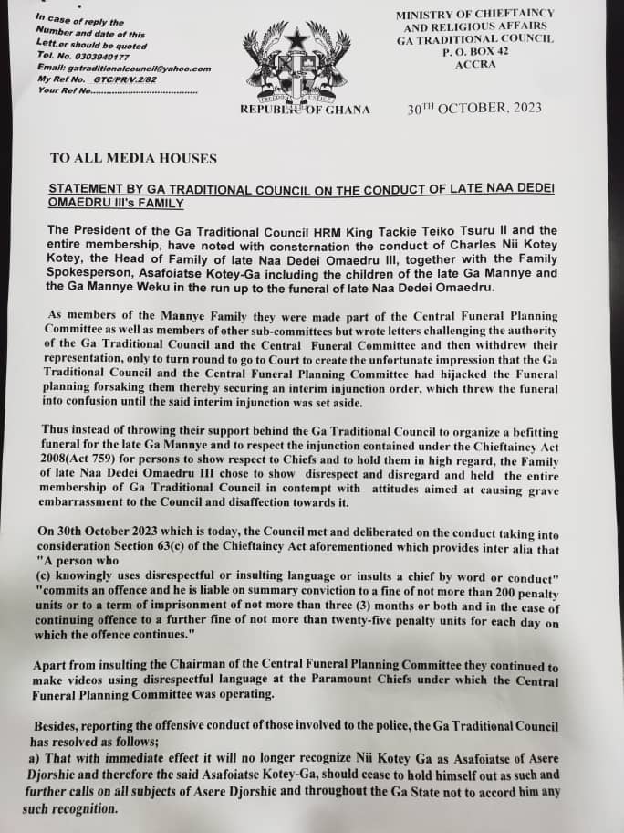 The decision by the Ga Traditional Council follows the alleged misconduct of the Head of the Family of the late Naa Dedei Omaedru III, Charles Nii Kotey Kotey, the Family Spokesperson, Asafoiatse Kotey-Ga, the children of the late Ga Manye, and the Ga Manye Weku in the run-up to the funeral of the late Naa Dedei Omaedru.