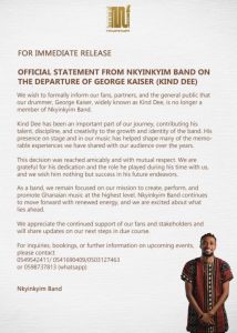 Music group Nkyinkyim Band has officially announced the departure of its drummer, George Kaiser, popularly known as Kind Dee.