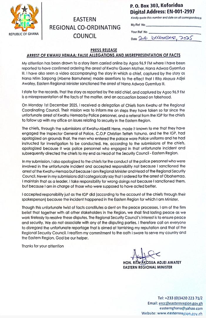 She clarified that on December 1, 2025, a group of Kwahu chiefs came to the Eastern Regional Coordinating Council to update her on the actions taken following the Queen Mother’s arrest and to follow up on a referral from the Inspector General of Police (IGP), C.O.P. Christian Tetteh Yahuna.