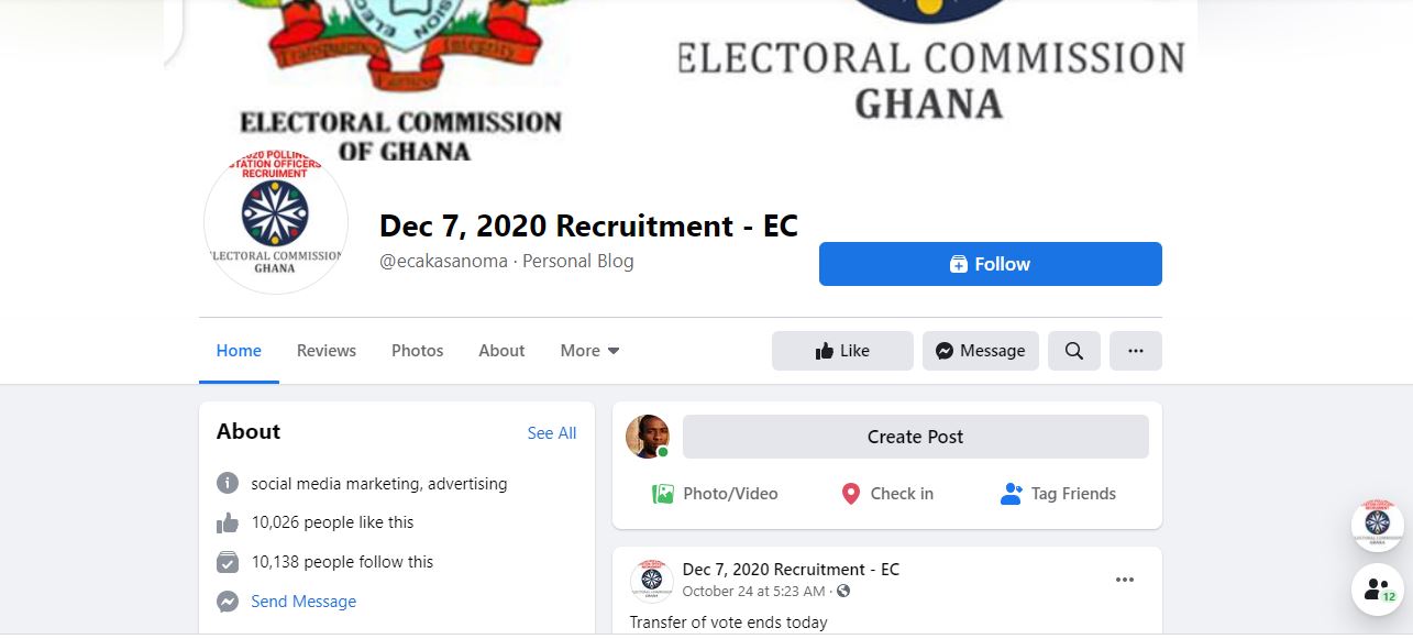 Ahead of the December 7 polls, several social media pages have popped up, some announcing recruitments for the EC for the general elections.