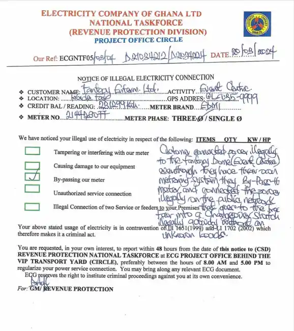 In a notice dated March 20, 2024, ECG revealed that the event company, situated at the Trade Fair site in Accra, was illegally consuming electricity.