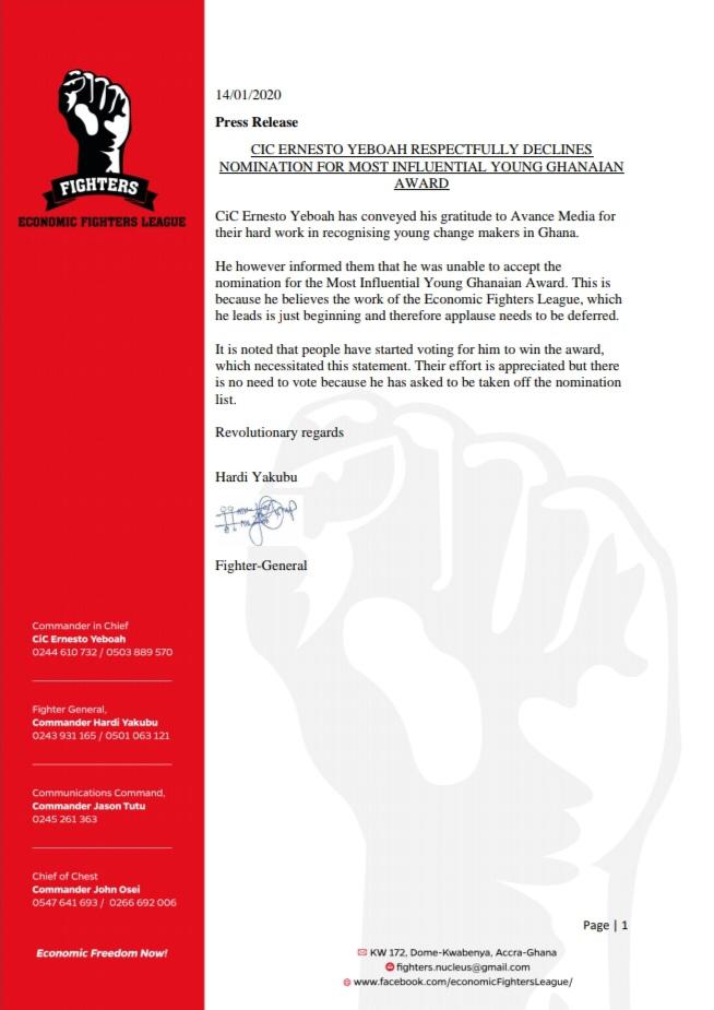 Commander-in-Chief of the Economic Fighters League, Ernesto Yeboah, has rejected a nomination for the most influential young Ghanaian award.