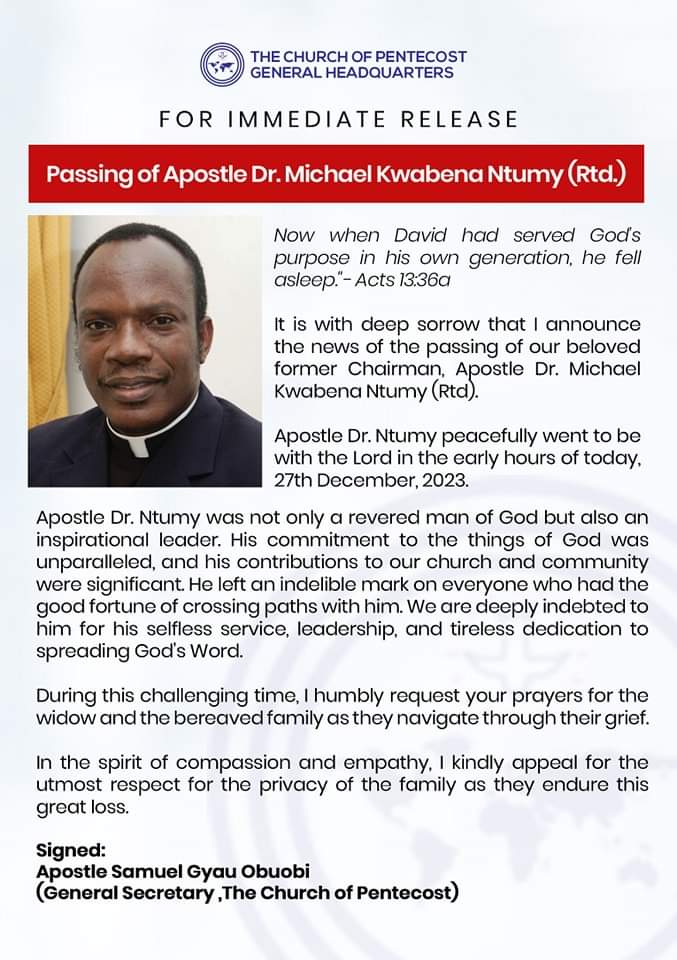 The Church of Pentecost in a statement released on December 27, said the late “Apostle Dr. Ntumy was not only a reverend man of God but also an inspirational leader. His commitment to the things of God was unparalleled, and his contributions to our church and community were significant. He left an indelible mark on everyone who had the good fortune of crossing paths with him. We are deeply indebted to him for his selfless service, leadership, and tireless dedication to spreading God’s word”.