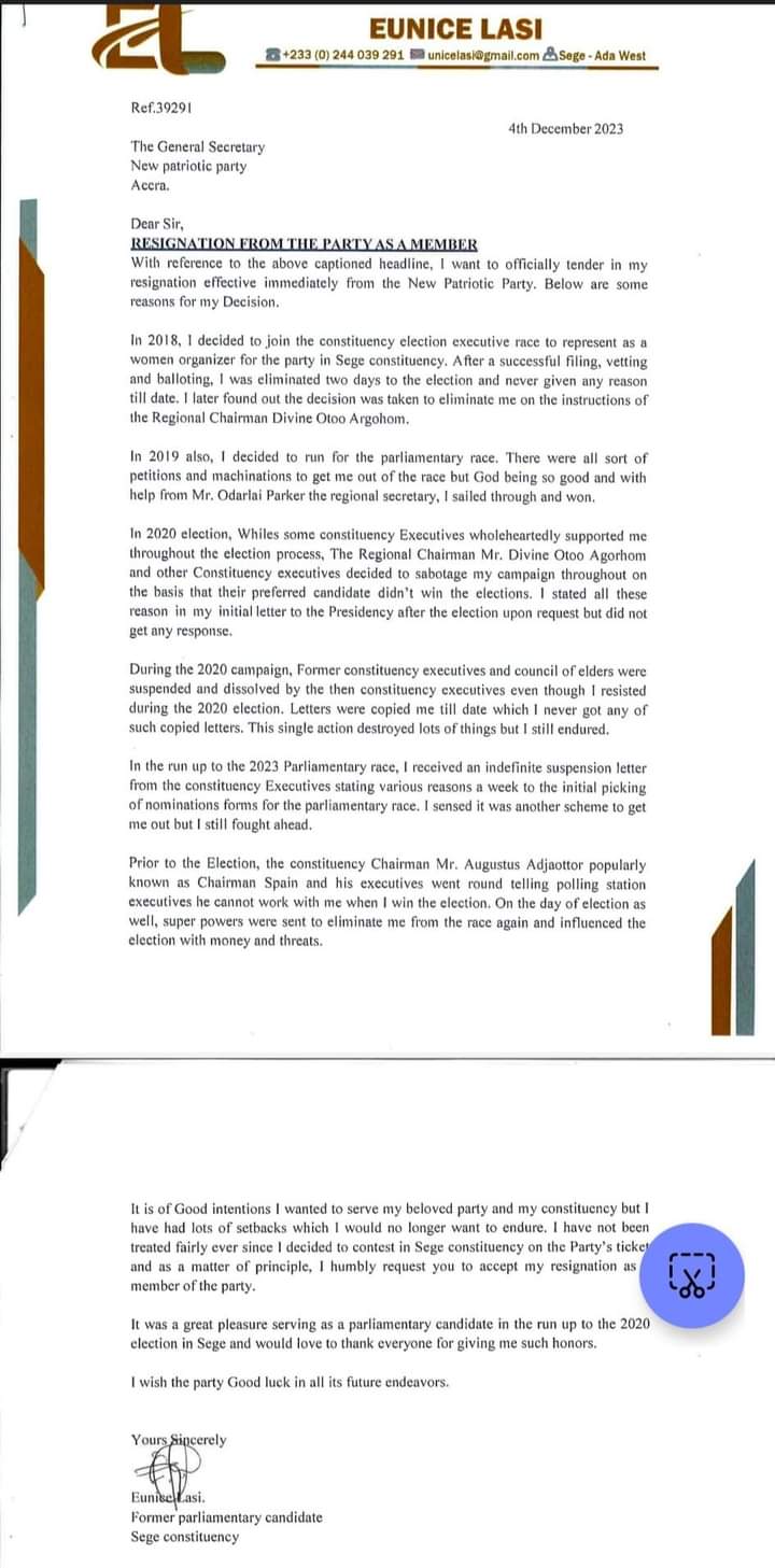 The 2020 New Patriotic Party (NPP) parliamentary candidate for Sege, Eunice Lasi, has officially resigned from the party.